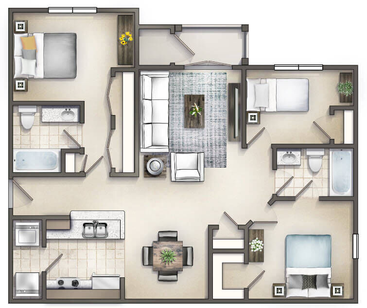 Modelo de apartamento: The DaytonaDesde $1,8353 Dormitorios, 2 Baños, 1286 sq ftDisponible November 22, 2025![]()