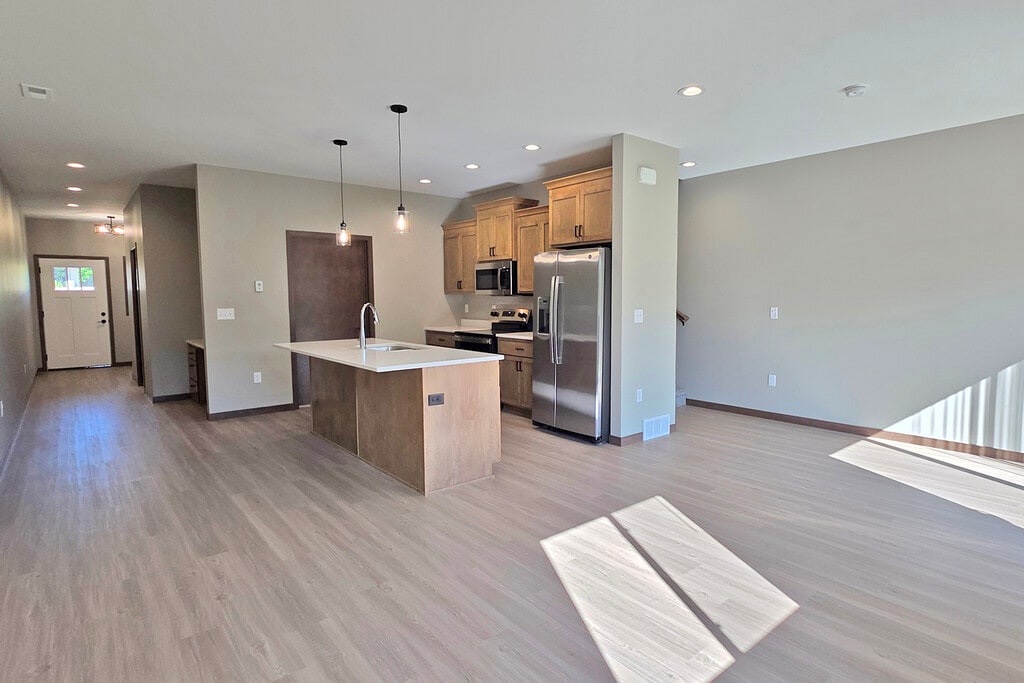 Available Now – Newly Built 3 Bedroom, 2.5 Bath Townhome This beautiful 1,800 SqFt townhome offers the convenience of modern living with 3 bedrooms, 2.5 bathrooms, in-unit laundry, central air and an attached garage. The stylish kitchen features quartz countertops, custom cabinetry and stainless steel appliances to include a stove/oven, refrigerator, dishwasher and microwave. The primary suite boasts a private bath and walk-in closet, while the two additional bedrooms provide ample space with walk-in closets. Relax on your private patio and leave the maintenance to us—lawn care and snow removal are provided! One small pet (under 20 lbs.) is negotiable with a $500 deposit and $50/month pet rent. v