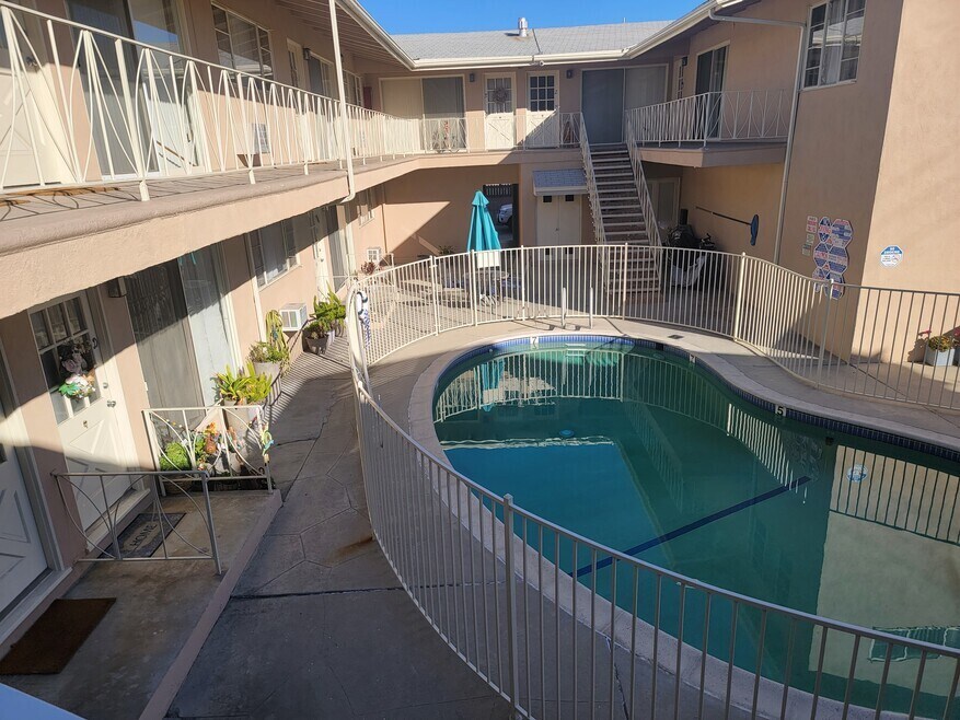 Mediados de siglo de dos pisos y apartamentos con patio abierto. Estacionamiento privado y entrada.