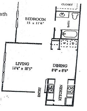 Modelo de apartamento: 1 Bed 1 Bath$5731 Dormitorio, 1 Baño, 692 sq ftNo Disponible1 Bed 1 Bath - Plano 1 1 Bed 1 Bath