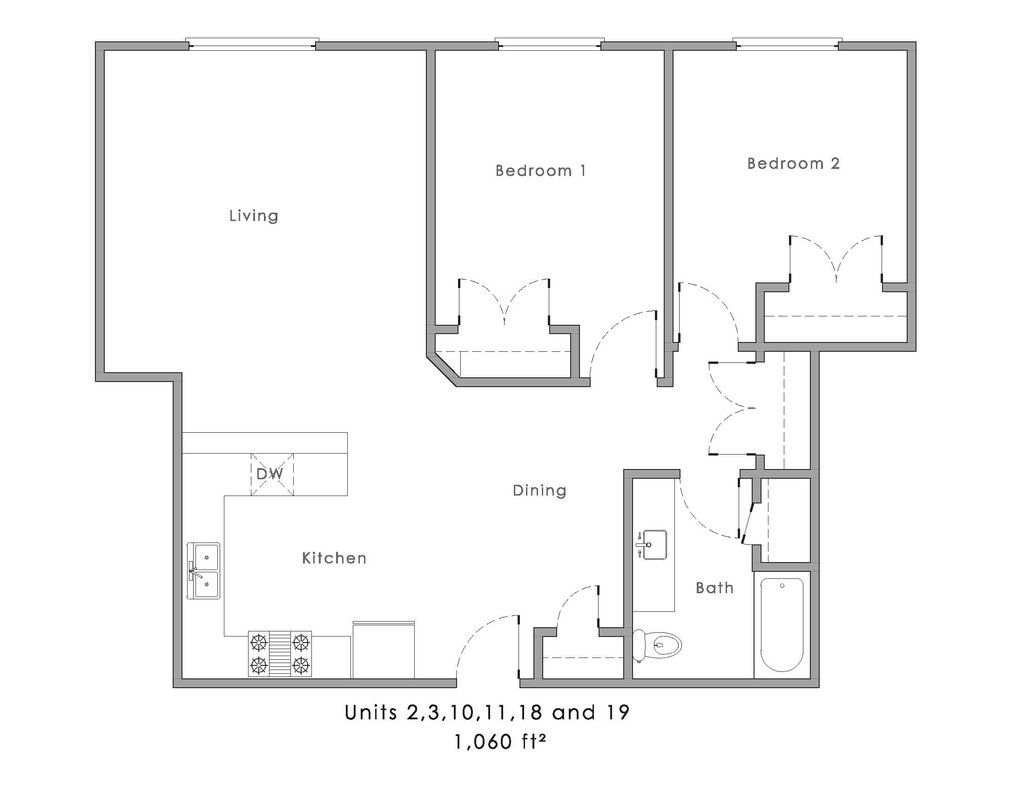 2 Dormitorios, 1 Baño, 1060 pies²Galería del Modelo