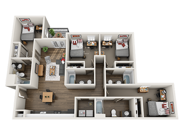 4X4 - Plano 1 Unidad de apartamento: PrivateModelo de apartamento: 4X4$1,0394 Dormitorios, 4 Baños, 1239 sq ftDisponible August 12, 20264X4 UP