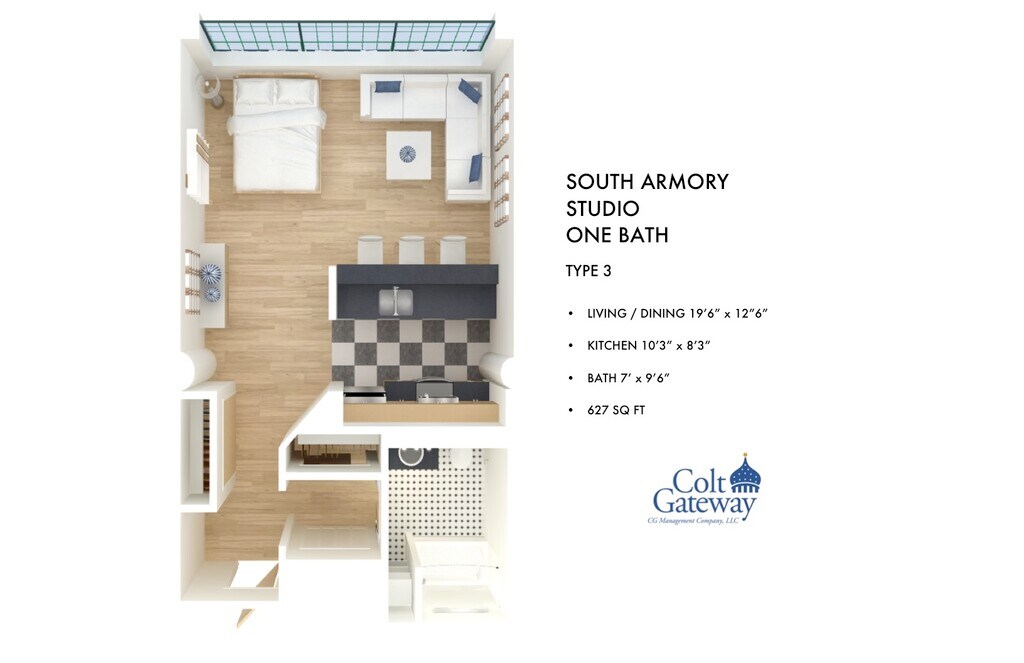 Unidad de apartamento: SouthArmory-331Modelo de apartamento: Studio$1,425Estudio, 1 Baño, 612 sq ftDisponible October 17, 20251 Dormitorio