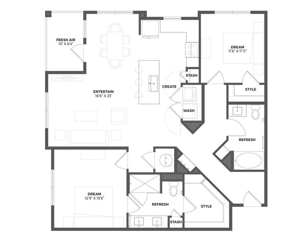 1 Dormitorio, 1 Baño, 832 pies²Disponible AhoraGalería del Modelo