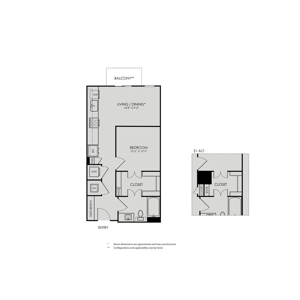 Modelo de apartamento: S1Llame para PreciosEstudio, 1 Baño, 583-608 sq ftNo DisponibleS1 - Plano 1 Plano: S1A