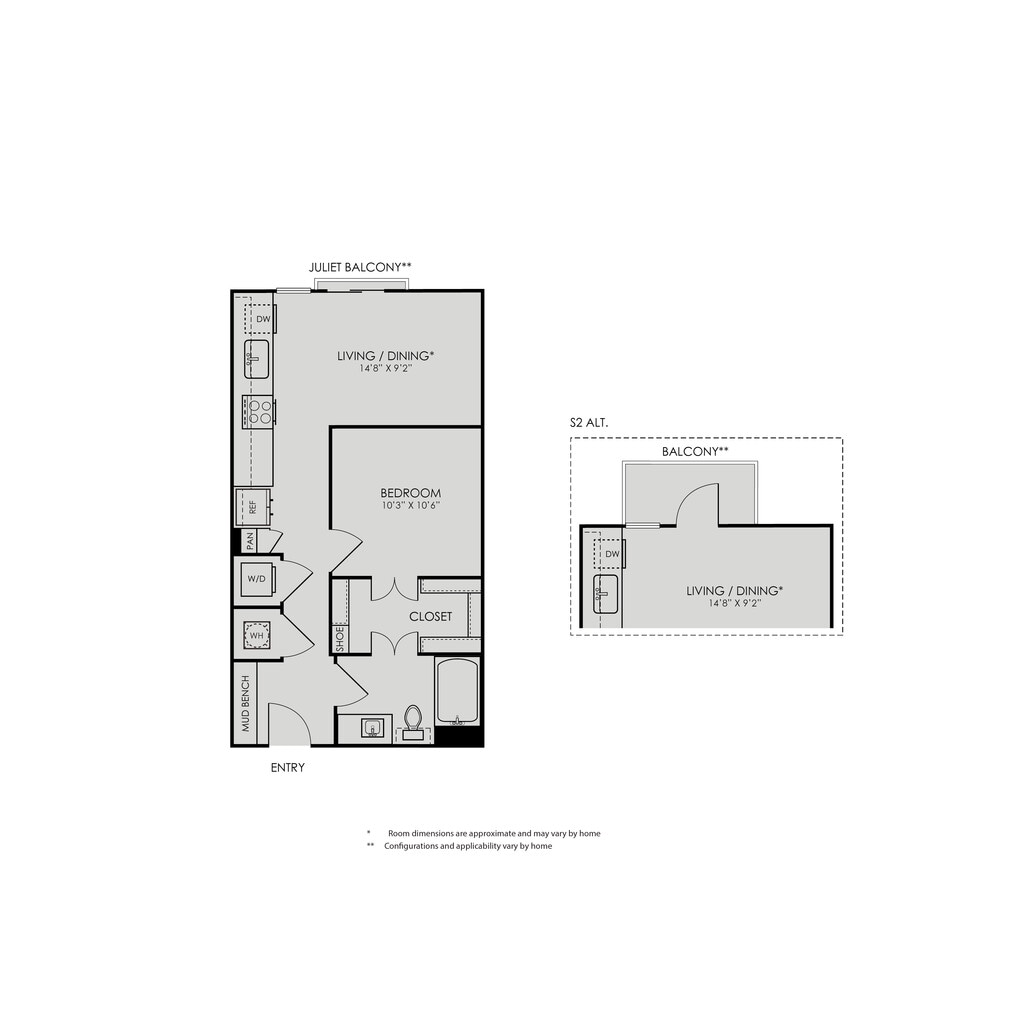 Modelo de apartamento: S2Llame para PreciosEstudio, 1 Baño, 580 sq ftNo DisponibleS2 - Plano 1 Plano: S1