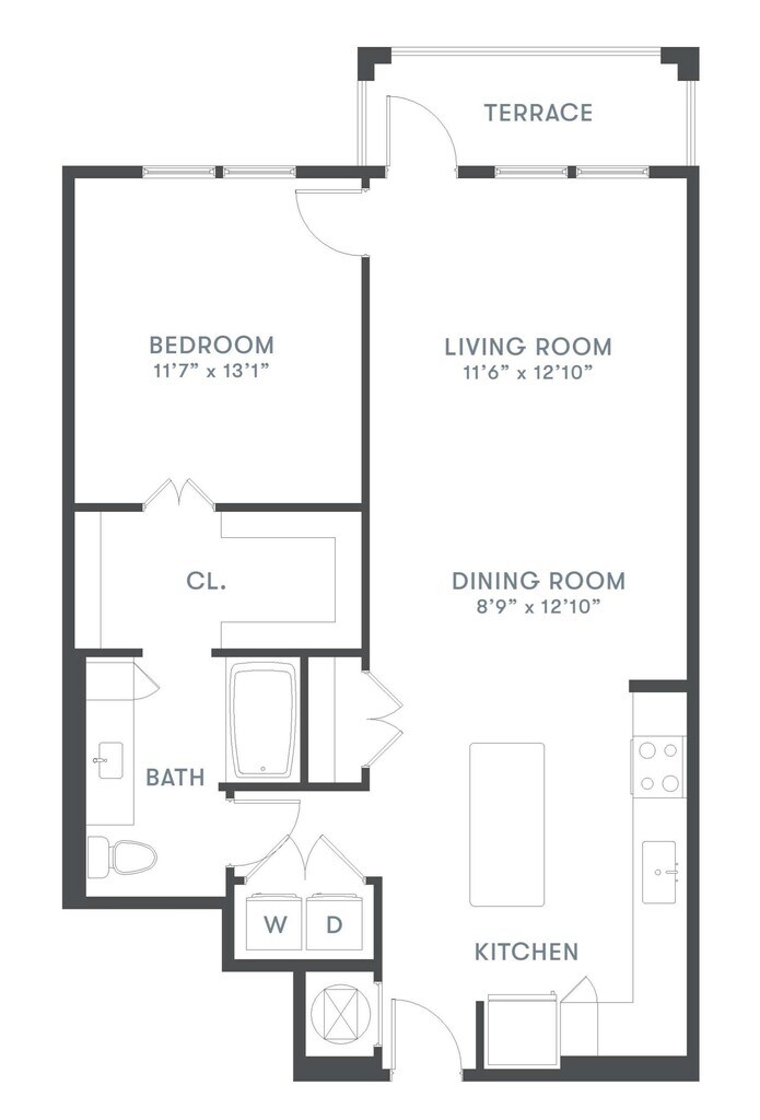 Modelo de apartamento: A1Desde $1,7231 Dormitorio, 1 Baño, 729 sq ftDisponible Ahora![]()