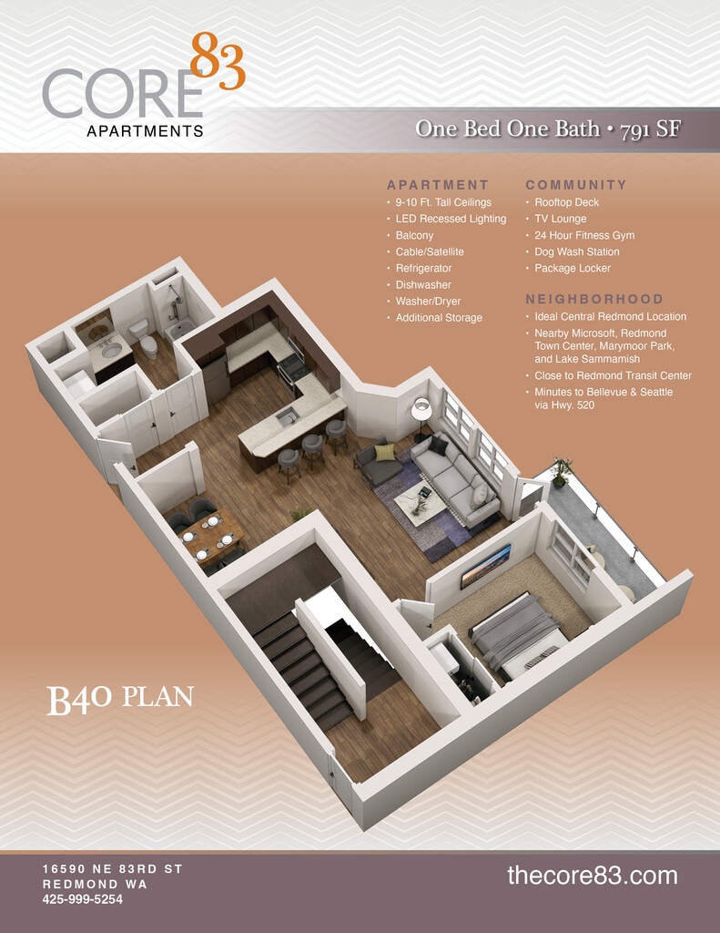 Core 83 Apartments se encuentra en el Barrio Downtown Redmond y el código postal 98052 de Redmond, WA. Esta comunidad está gestionada profesionalmente por Precision Management