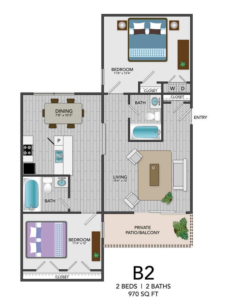 2 Dormitorios, 2 Baños, 970 pies²Disponible AhoraGalería del Modelo