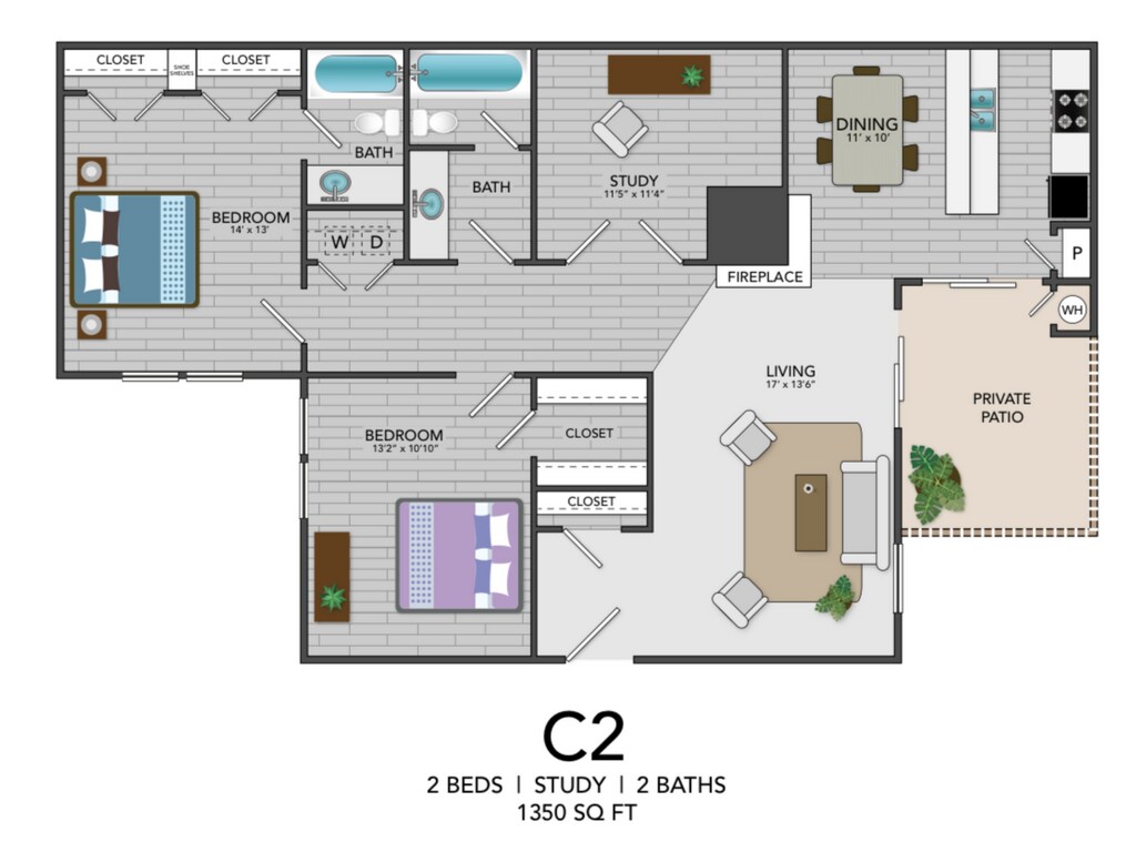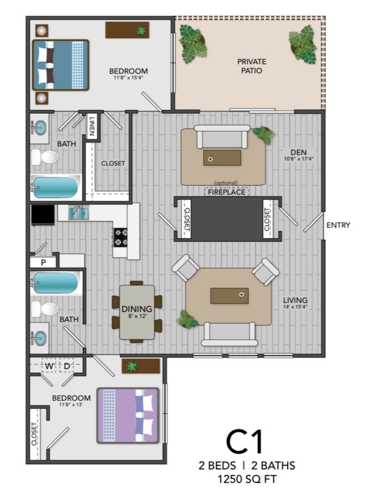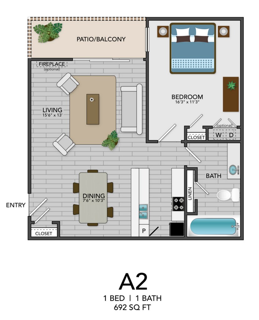Modelo de apartamento: A2Desde $1,2351 Dormitorio, 1 Baño, 692 sq ftDisponible Ahora![]()