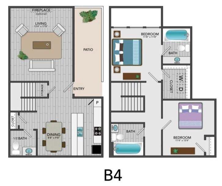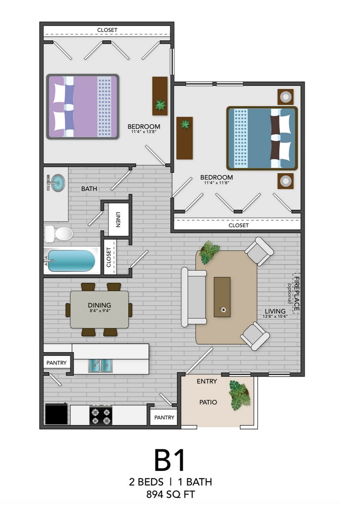 Modelo de apartamento: B1Desde $1,3652 Dormitorios, 1 Baño, 894 sq ftDisponible Ahora![]()