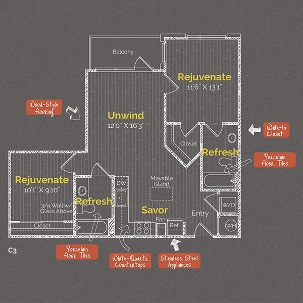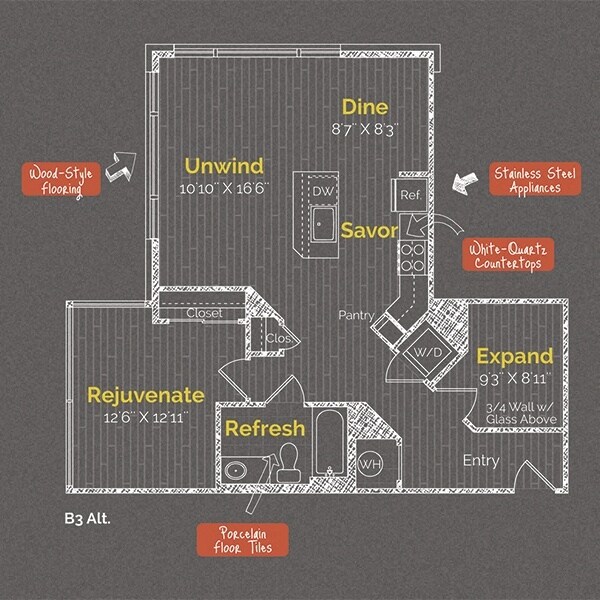 Modelo de apartamento: 1 Bed/1 Bath - A1HLlame para Precios1 Dormitorio, 1 Baño, 698 sq ftDisponible Ahora![]()