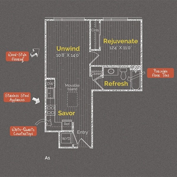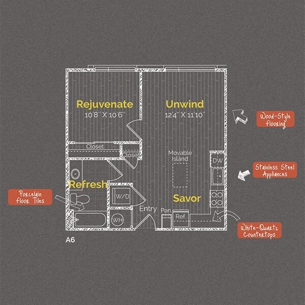 Modelo de apartamento: 1 Bed/1 Bath - A1DLlame para Precios1 Dormitorio, 1 Baño, 609 sq ftDisponible Ahora![]()