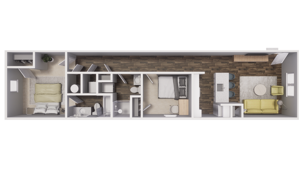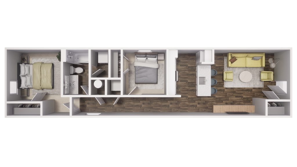2 Dormitorios, 2 Baños, 875 pies²Precio Mensual TotalDisponible AhoraGalería del Modelo