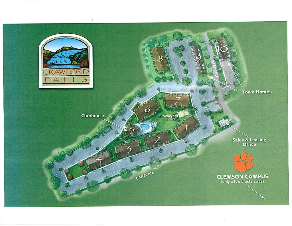 ¡Estamos alquilando para otoño de 2016! Crawford Falls es el mejor en viviendas fuera del campus. Ubicado a menos de una milla de la Universidad de Clemson, Crawford Falls es la solución perfecta para aquellos que desean vivir fuera del campus pero a una caminata de distancia de él. Elige entre espaciosos planos de planta estilo jardín o casa adosada que ofrecen un medio baño adicional para invitados. Crawford Falls está ubicado en la ruta de autobús CAT.