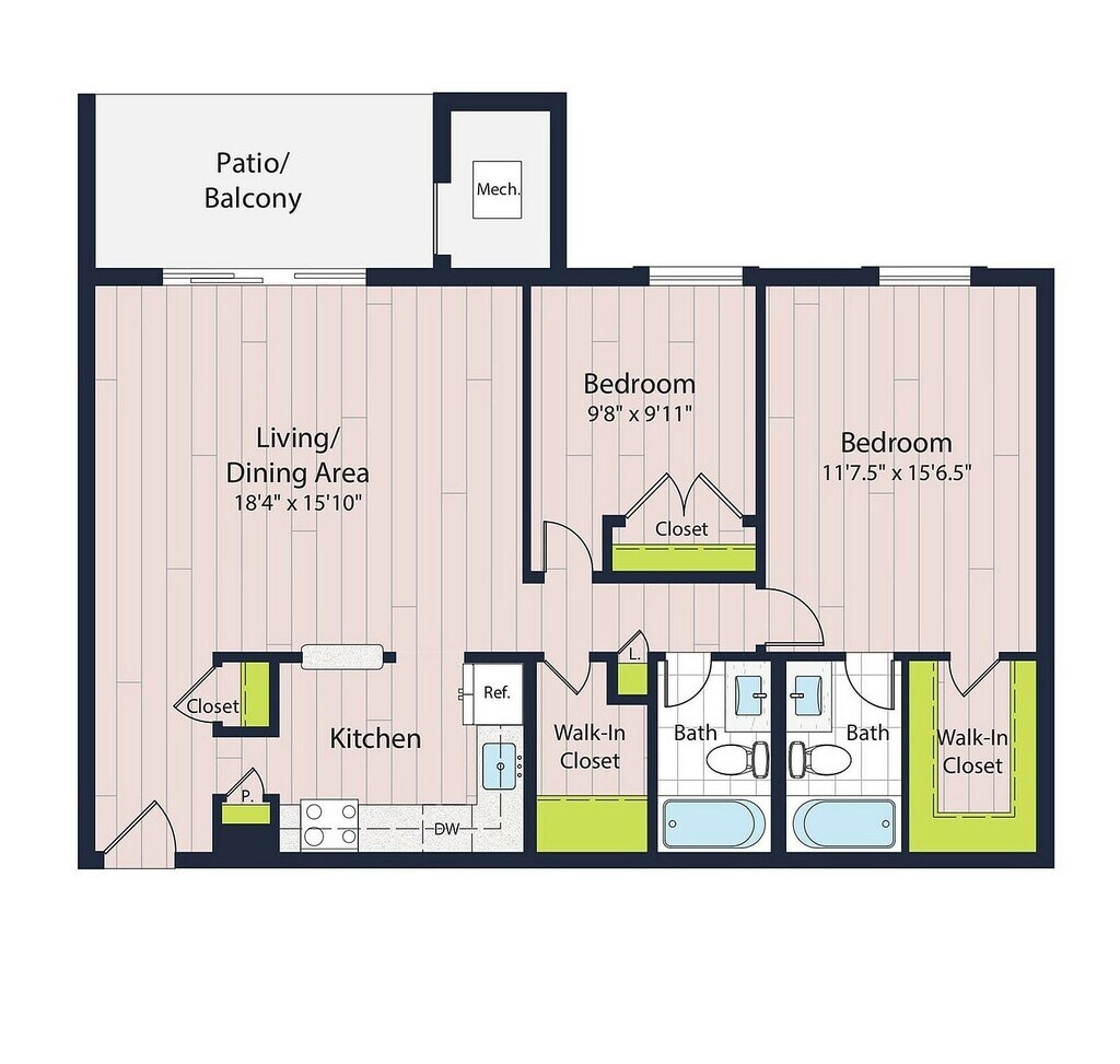 Modelo de apartamento: B2-702 Dormitorios, 2 Baños, 981 sq ftDisponible Ahora![]()