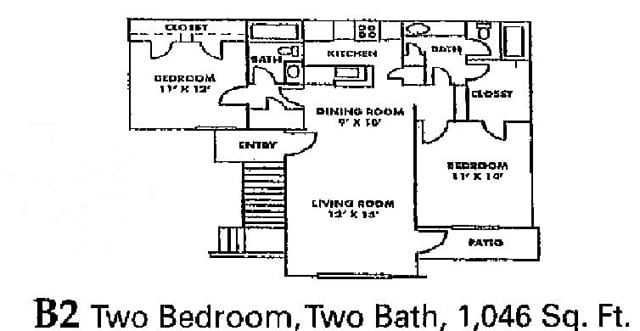 Modelo de apartamento: B22 Dormitorios, 2 Baños, 1046 sq ftNo DisponibleB2 - Plano 1 3 Dormitorios