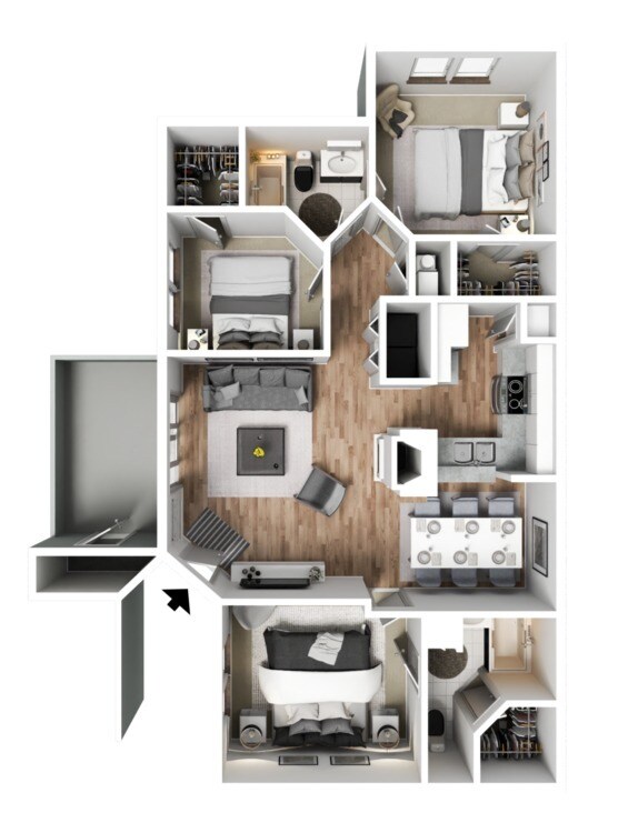 Modelo de apartamento: 3 BedroomDesde $1,6383 Dormitorios, 2 Baños, 1223 sq ftDisponible Ahora3 Bedroom - Plano 1