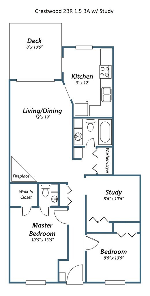 1 Bed 1.5 Bath w/ Study - Plano 1 1 Bed 1.5 Bath w/ Study & Fireplace