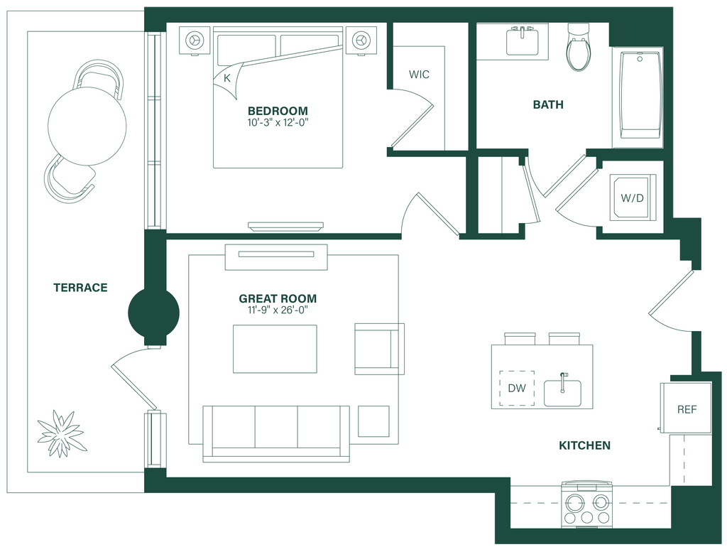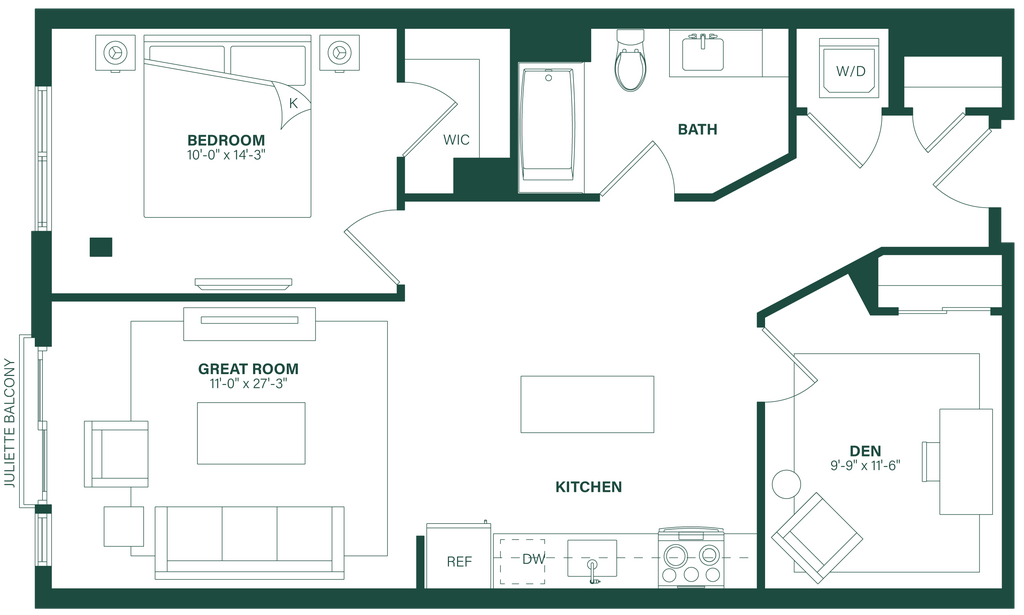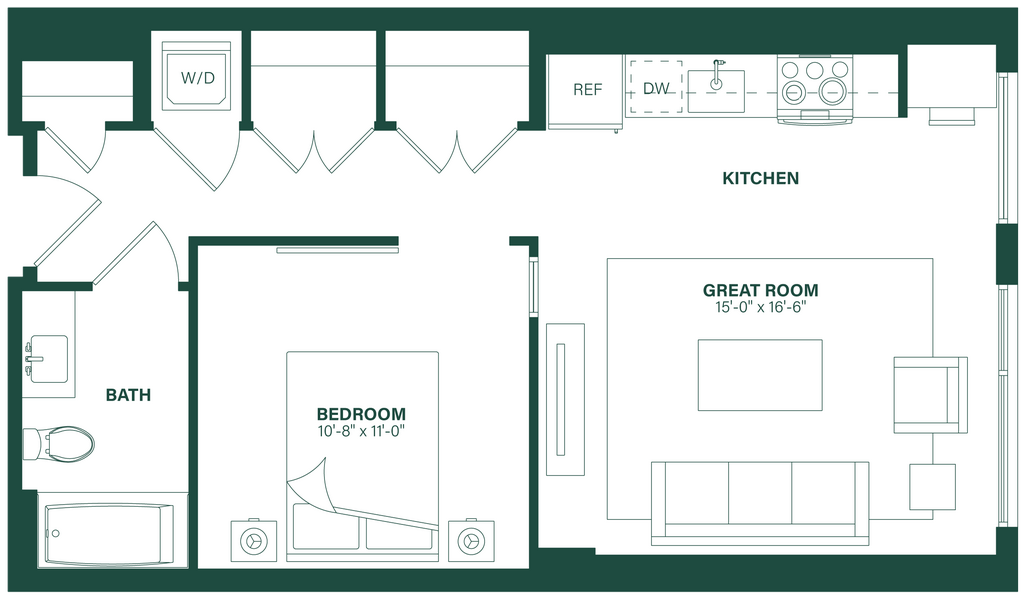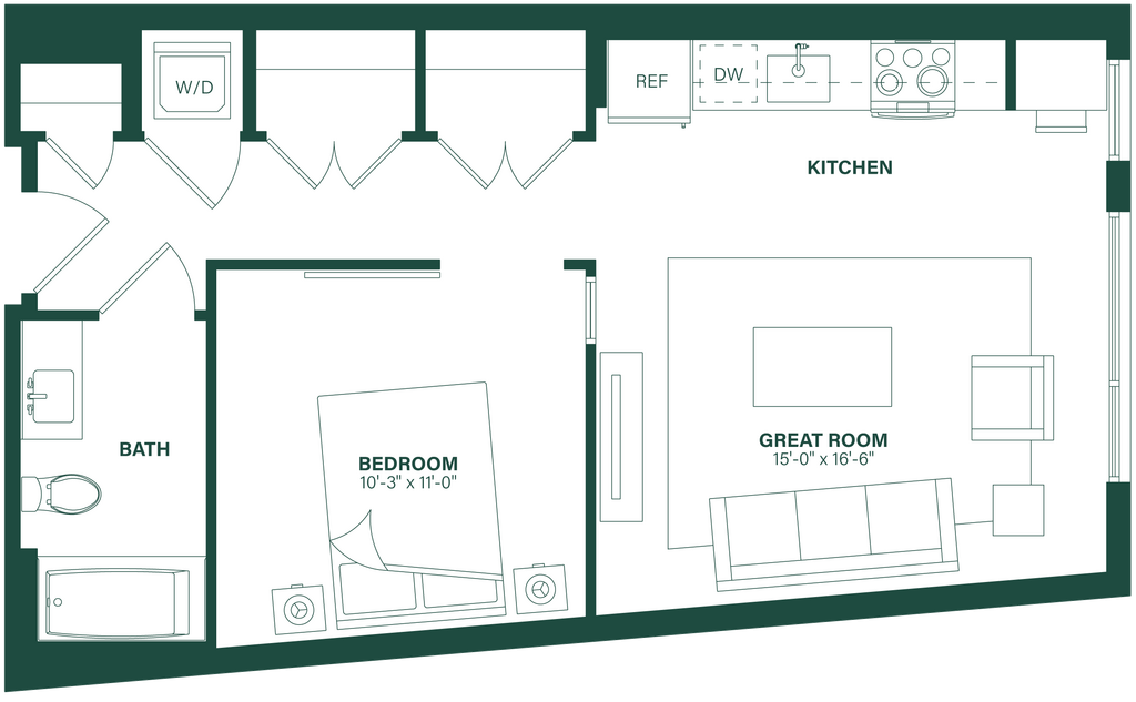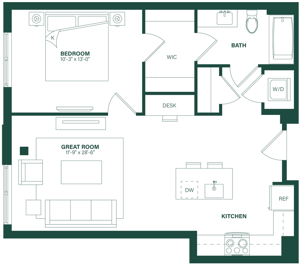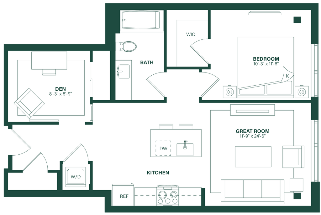 1 Dormitorio, 1 Baño, 548-606 pies²Más CargosDisponible May 15Galería del Modelo