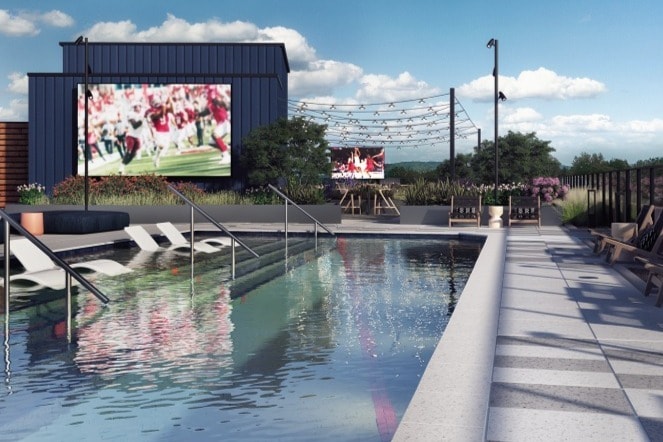 - Piscina estilo resort en la azotea con plataforma para broncearse, cabañas y pantalla gigante