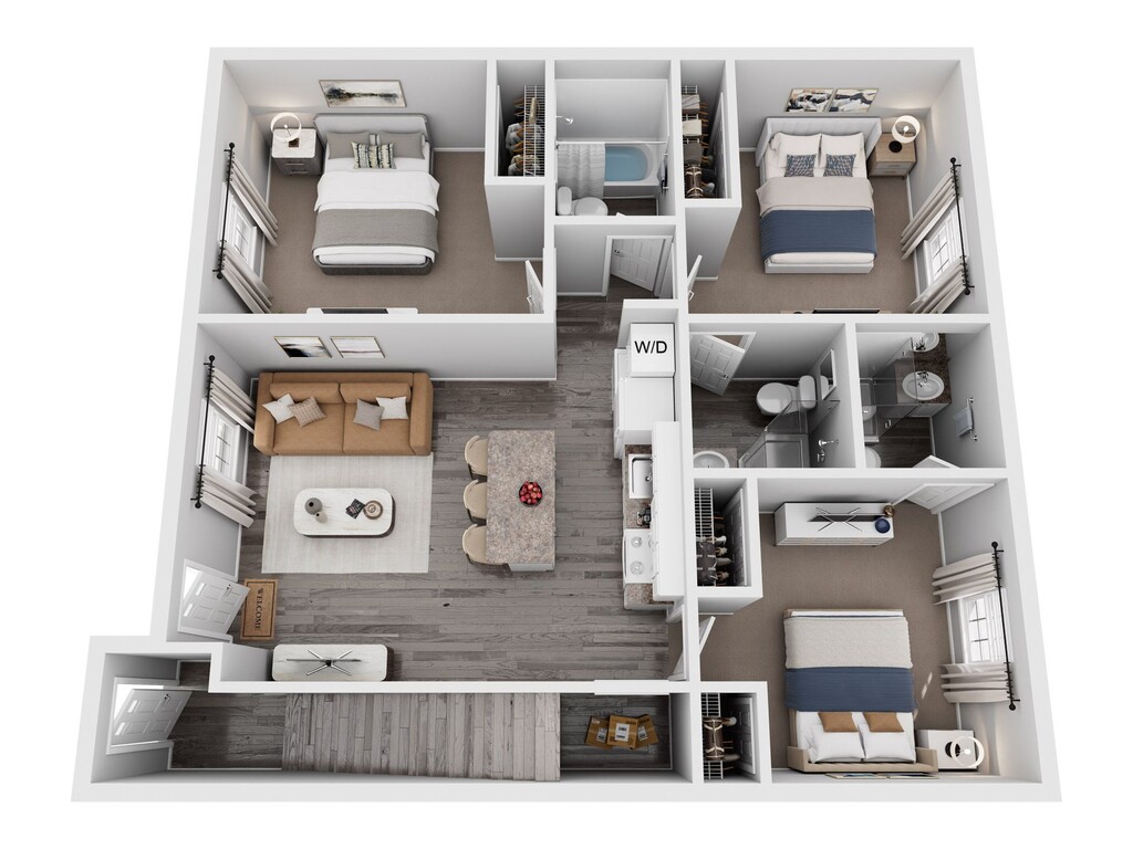 Modelo de apartamento: The Ridgeview$1,7503 Dormitorios, 3 Baños, 944 sq ftDisponible AhoraLos planos son representaciones artísticas. Todas las dimensiones son aproximadas. El producto y las especificaciones reales pueden variar en tamaño o detalle. No todas las características están disponibles en cada vivienda en alquiler. Por favor, consulta con un representante para obtener más detalles.