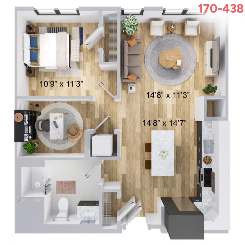 Unidad: 170-343 - Imagen Unidad de apartamento: 170-438Modelo de apartamento: 1 BEDROOM WITH DEN$2,7841 Dormitorio, 1 Baño, 821 sq ftDisponible Ahora![]()