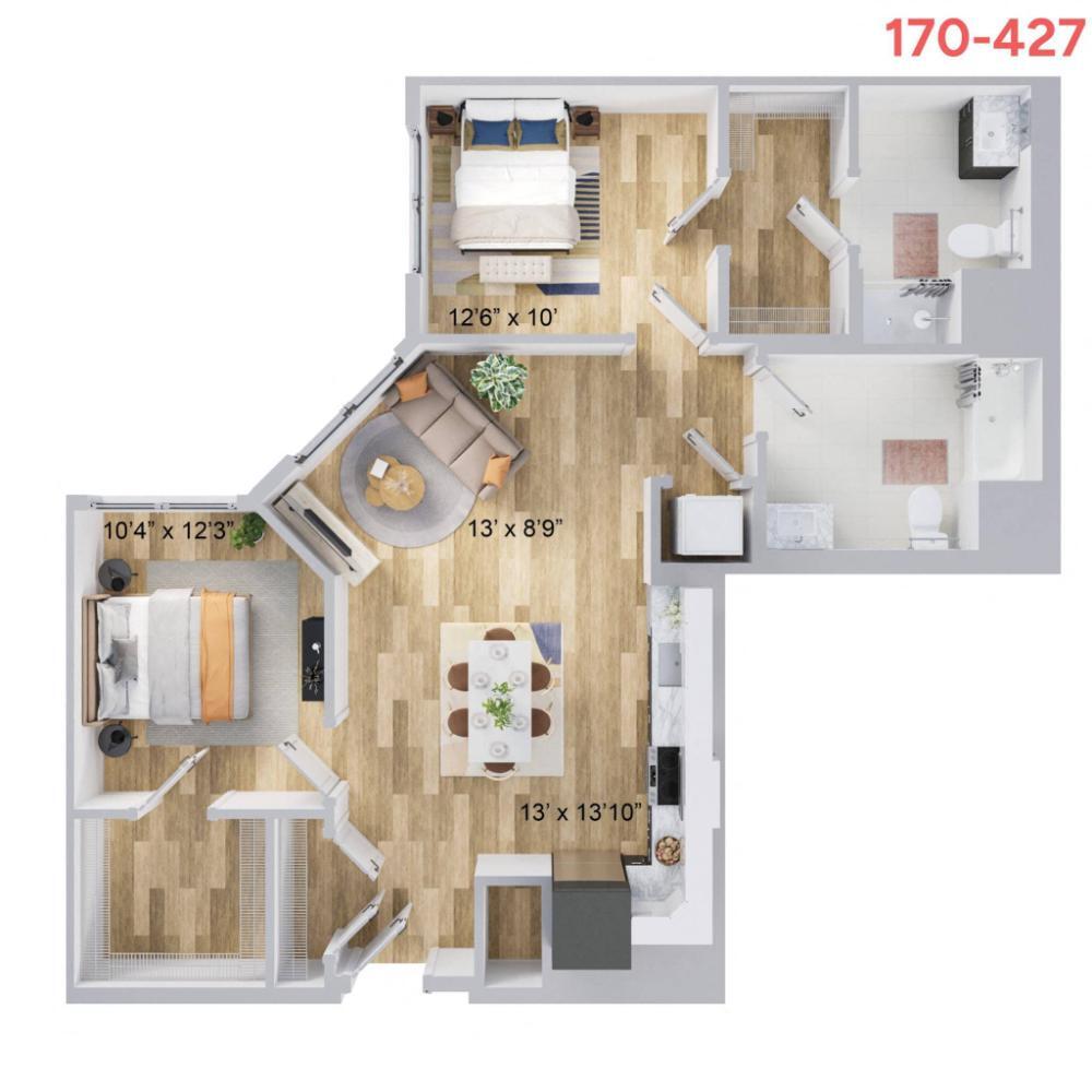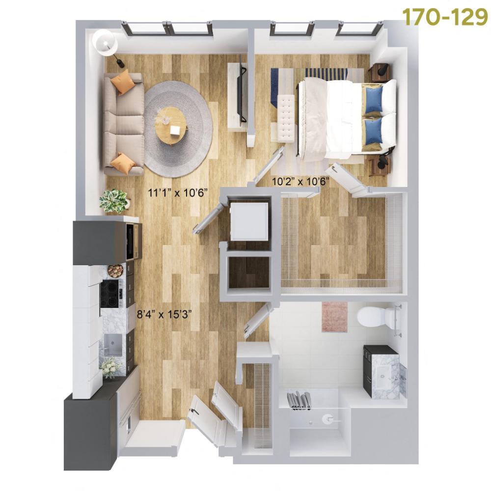 Unidad: 170-129 - Imagen 1 Unidad de apartamento: 170-131Modelo de apartamento: 1 BEDROOM$2,5751 Dormitorio, 1 Baño, 660 sq ftDisponible Ahora![]()