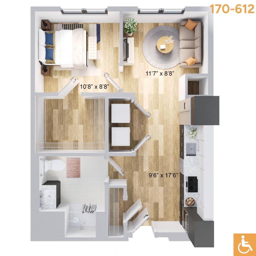 1 BEDROOM - Plano Unidad de apartamento: 170-612Modelo de apartamento: 1 BEDROOM$2,4841 Dormitorio, 1 Baño, 663 sq ftDisponible June 8, 2026![]()