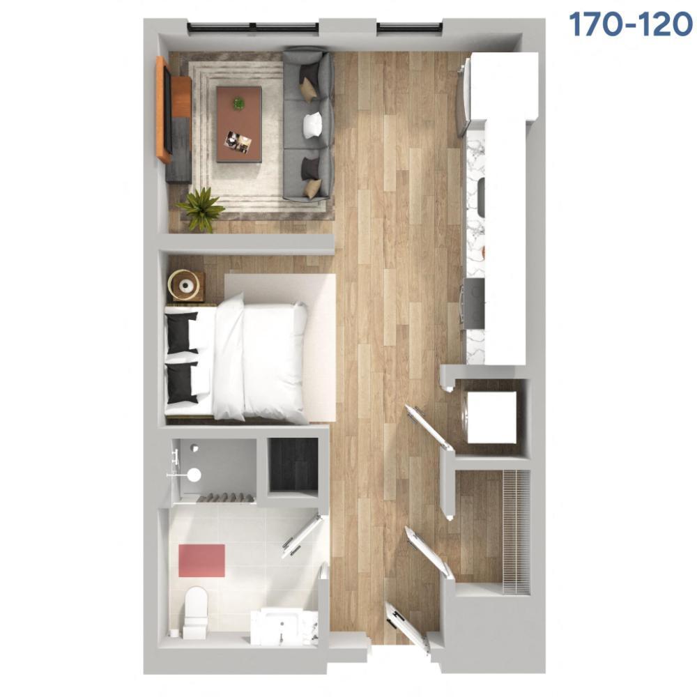 Unidad: 170-119 - Imagen 1 Unidad de apartamento: 170-120Modelo de apartamento: STUDIO$2,166Estudio, 1 Baño, 518 sq ftDisponible Ahora![]()
