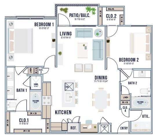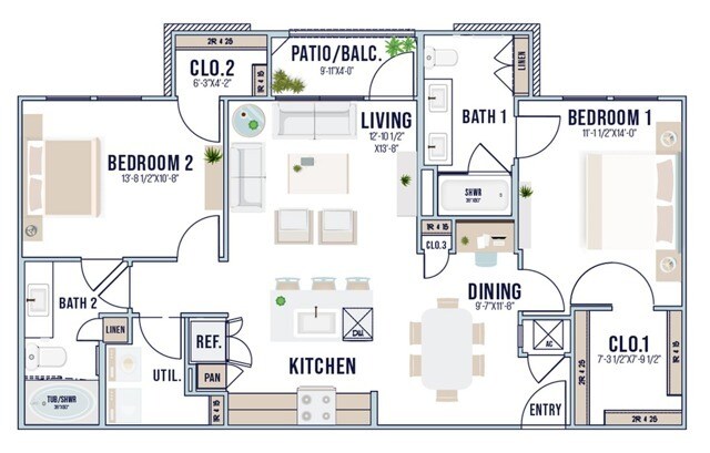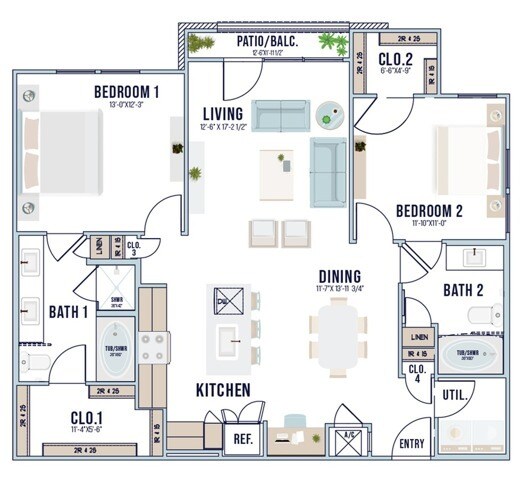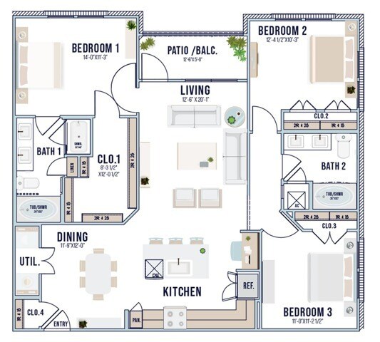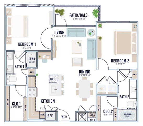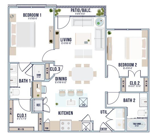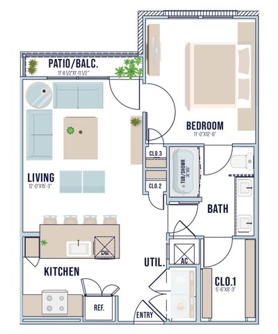 Modelo de apartamento: A3Llame para Precios1 Dormitorio, 1 Baño, 737 sq ftNo Disponible![]()