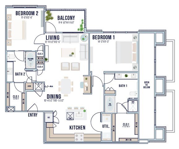 Modelo de apartamento: A8Llame para Precios1 Dormitorio, 1 Baño, 949 sq ftNo Disponible![]()