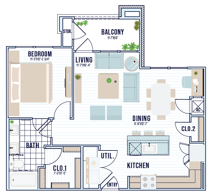 Modelo de apartamento: A1Desde $1,3901 Dormitorio, 1 Baño, 632 sq ftDisponible Ahora![]()