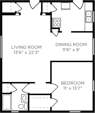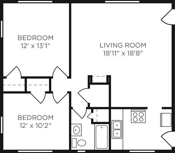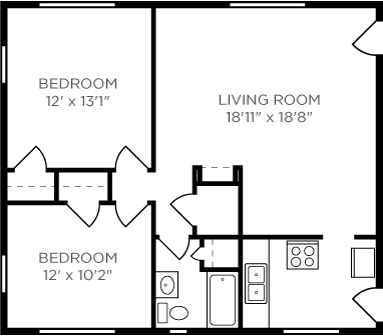 2 Dormitorios, 1 Baño, 1025 pies²El más grandeEsta opción tiene las unidades más grandes para este modeloGalería del Modelo