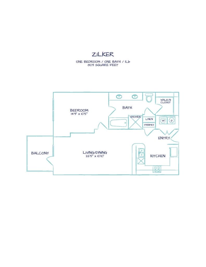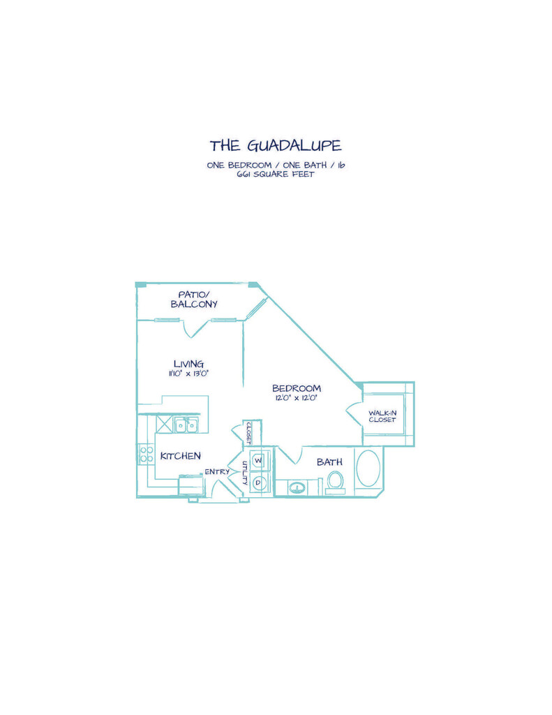Modelo de apartamento: The Guadalupe1 Dormitorio, 1 Baño, 661 sq ftNo DisponibleThe Guadalupe - Plano 1 Zilker