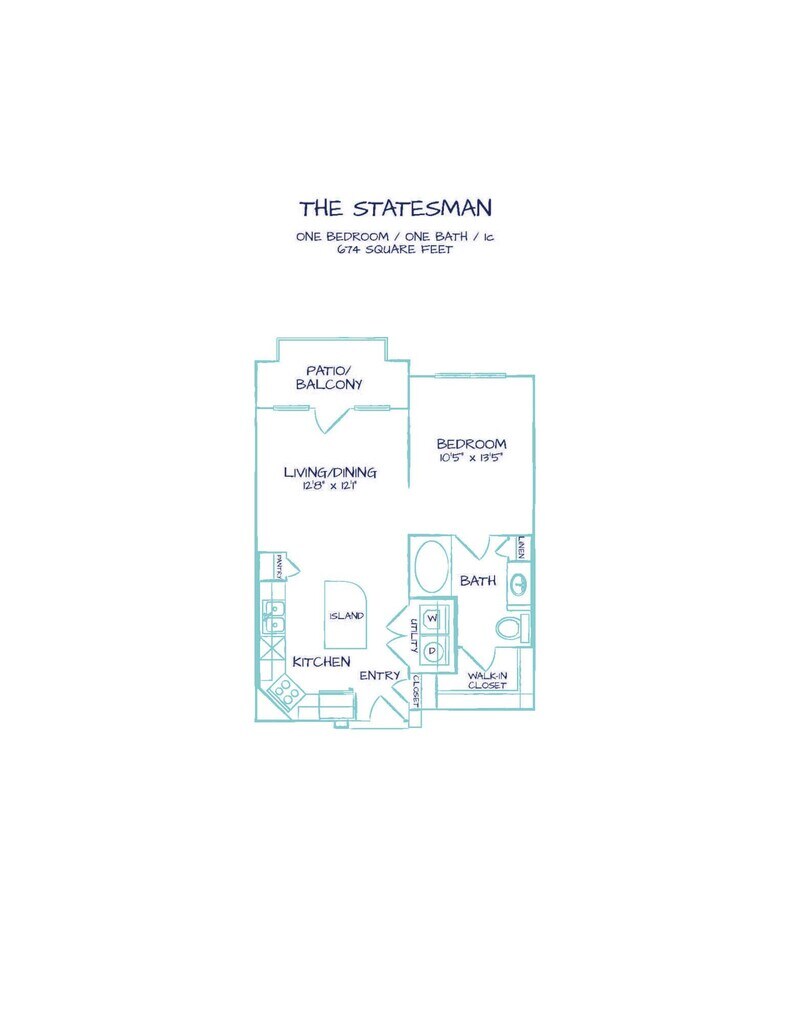 Modelo de apartamento: The Statesman1 Dormitorio, 1 Baño, 674 sq ftDisponible December 9, 2025The Statesman - Plano 1 Unidad de apartamento: 359Modelo de apartamento: The Statesman1 Dormitorio, 1 Baño, 674 sq ftDisponible December 9, 2025Spoke