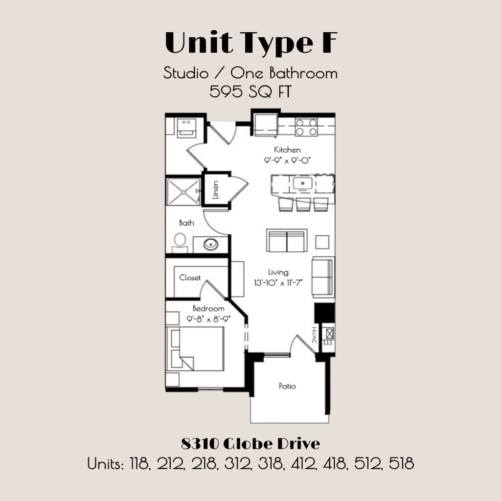 8310 F Studio (118, 212, 218, 312, 318, 412, 41... - Plano 1 Unidad de apartamento: 8310 Globe Drive - 318Modelo de apartamento: 8310 F Studio (118, 212, 218, 312, 318, 412, 41...$1,600Estudio, 1 Baño, 595 sq ftDisponible May 6, 2026![]()