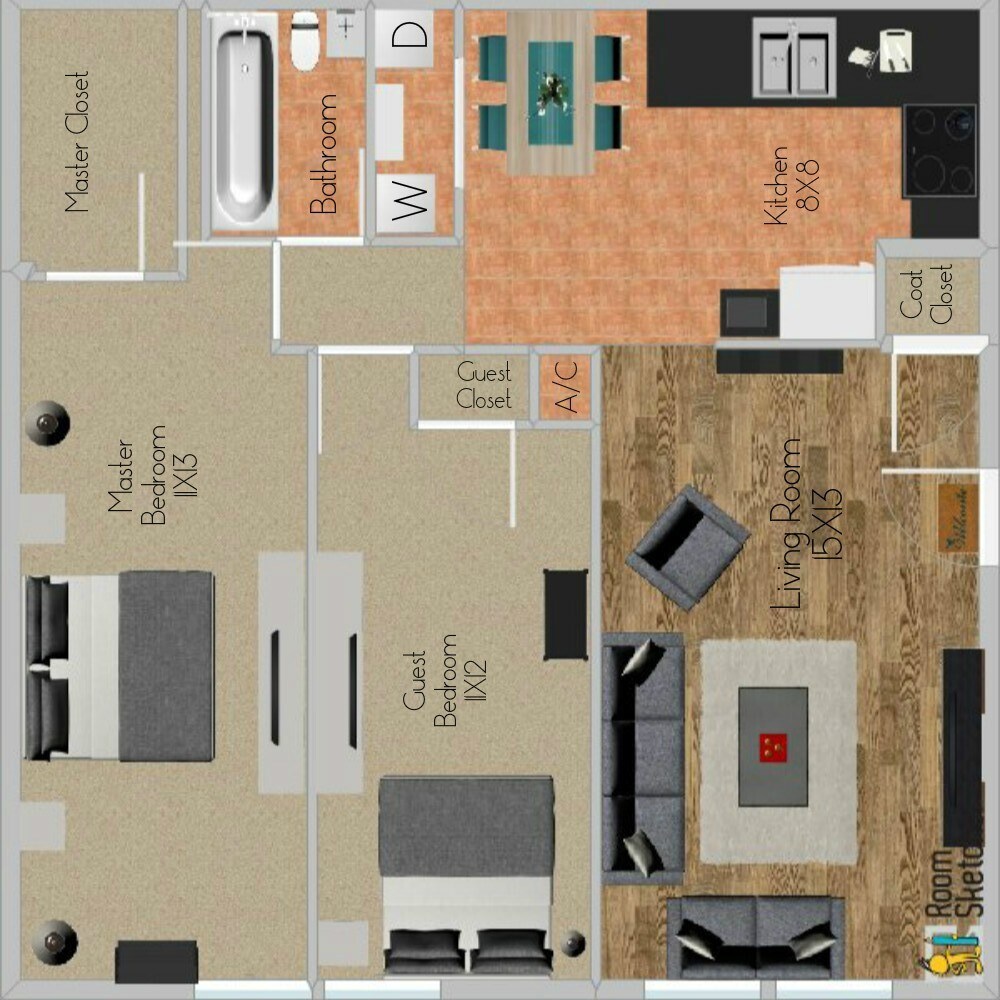 Modelo de apartamento: 2 Bedroom/1 Bath$9502 Dormitorios, 1 Baño, 776 sq ftDisponible AhoraPlanosFotos![]()