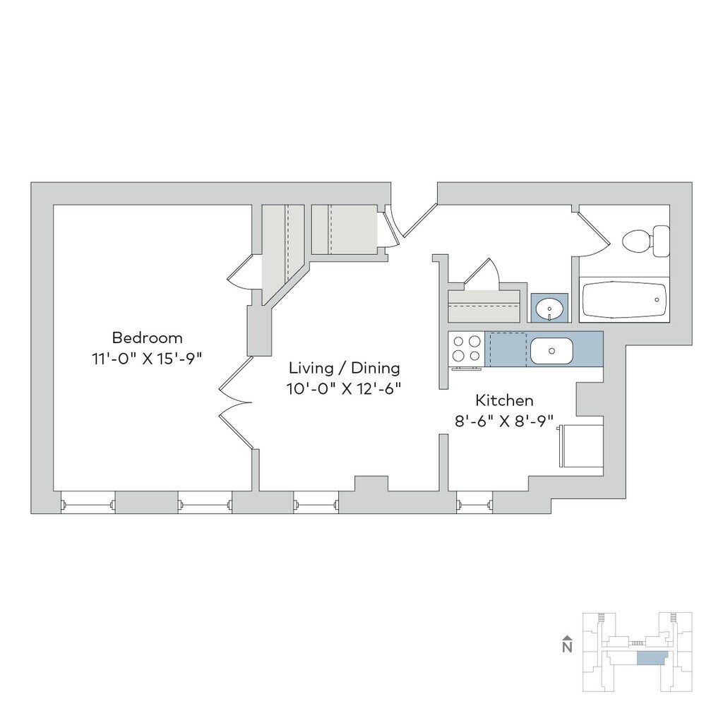Modelo de apartamento: delm1bA11 Dormitorio, 1 Baño, 550 sq ftDisponible November 22, 2025![]()