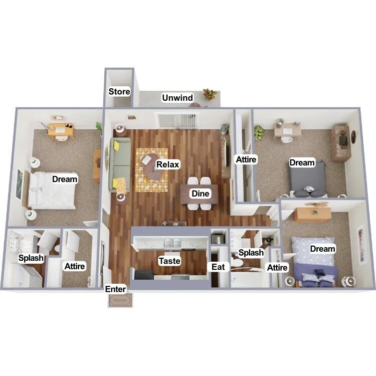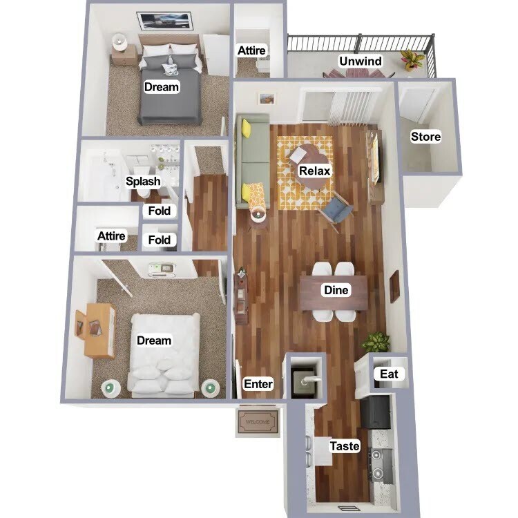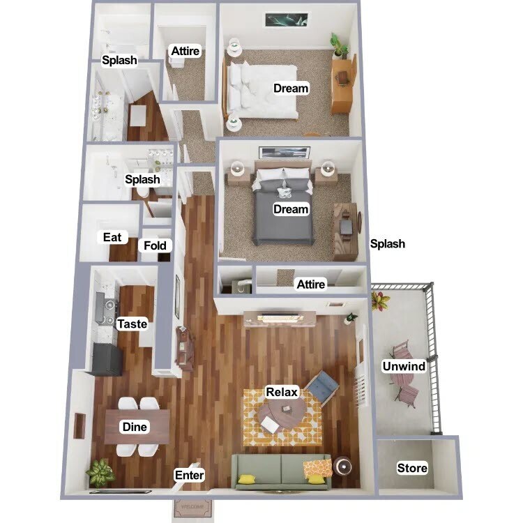 Modelo de apartamento: B2Desde $8502 Dormitorios, 1 Baño, 908-929 sq ftDisponible Ahora![]()