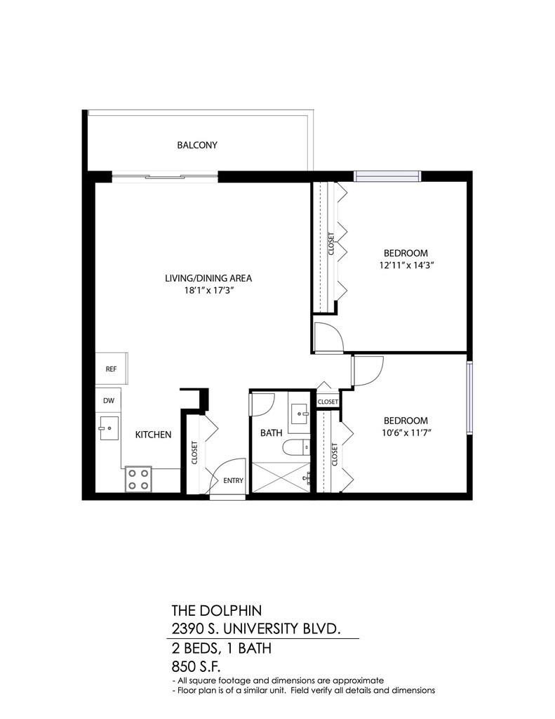 2 Bedroom, 1 Bathroom - Plano 1 Unidad de apartamento: 104Modelo de apartamento: 2 Bedroom, 1 Bathroom2 Dormitorios, 1 Baño, 850 sq ftDisponible Ahora![]()