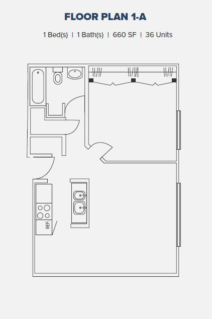 Modelo de apartamento: One Bed - 1ALlame para Precios1 Dormitorio, 1 Baño, 660 sq ftNo DisponibleOne Bed - 1A - Plano 1 One Bed - 1B