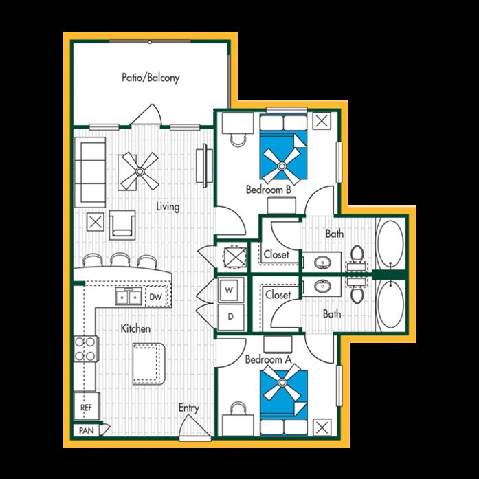 Modelo de apartamento: B22 Dormitorios, 2 Baños, 905 sq ftNo Disponible![]()