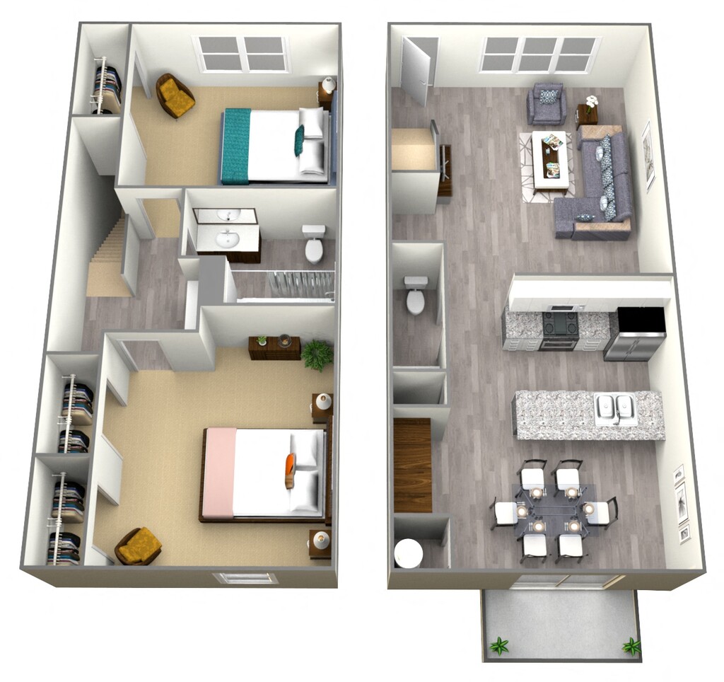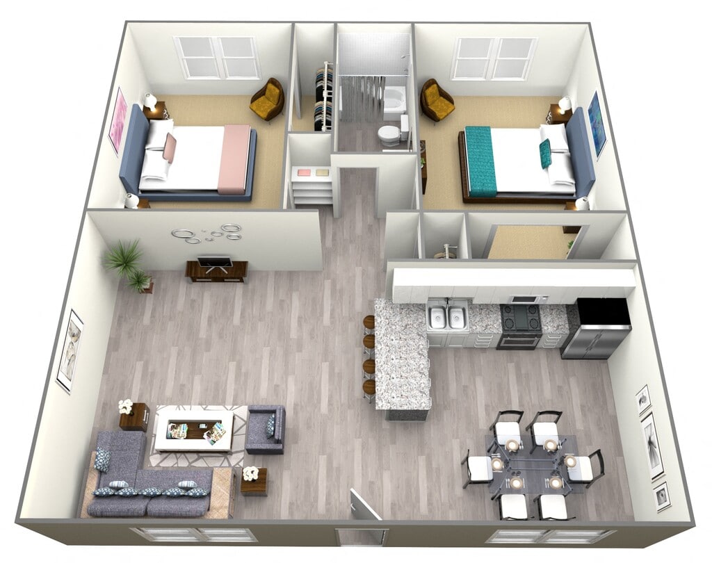 2 Dormitorios, 1 Baño, 830-850 pies²Disponible AhoraGalería del Modelo