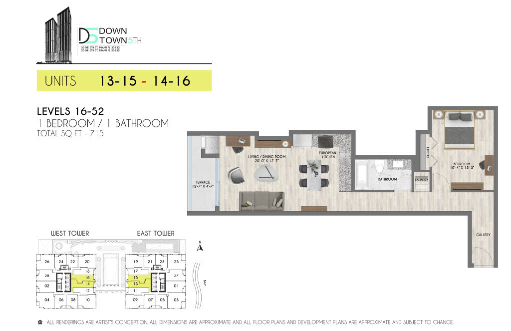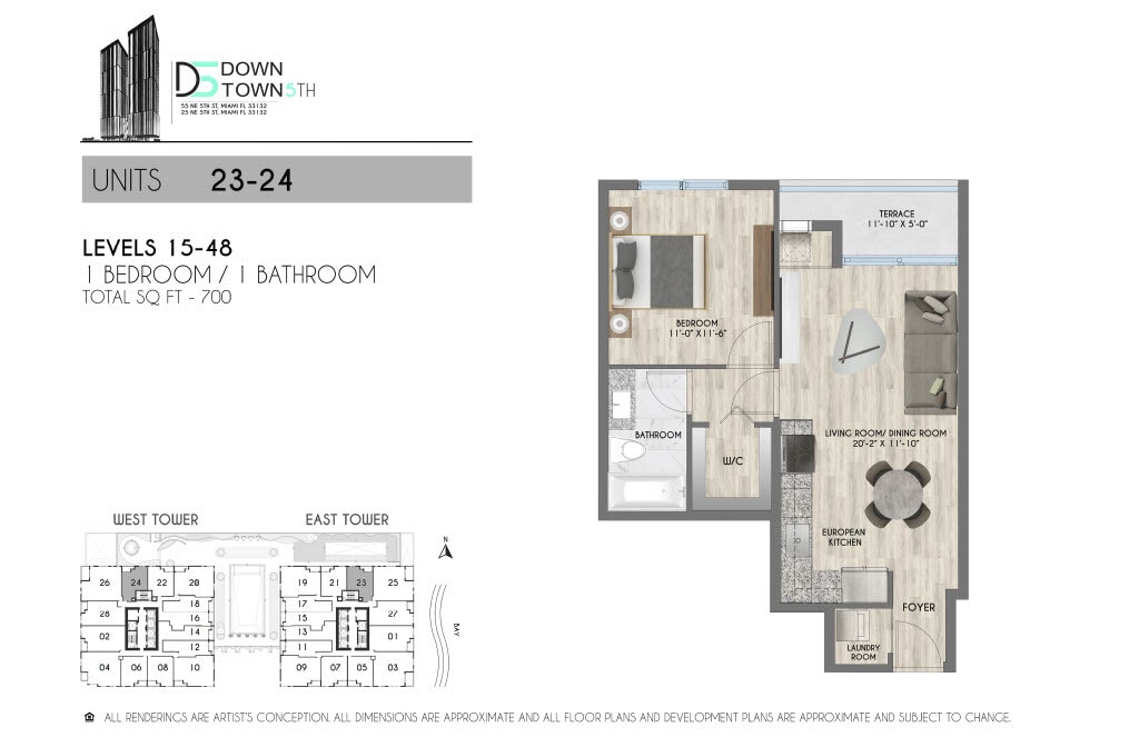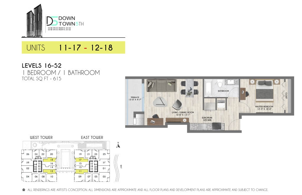 1 Dormitorio, 1 Baño, 615 pies²Disponible AhoraGalería del Modelo