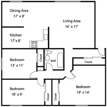 Modelo de apartamento: 3BR/1BA RenovatedLlame para Precios3 Dormitorios, 1 Baño, 1296 sq ftNo Disponible3BR/1BA Renovated - Plano 1 3BR/1BA Standard