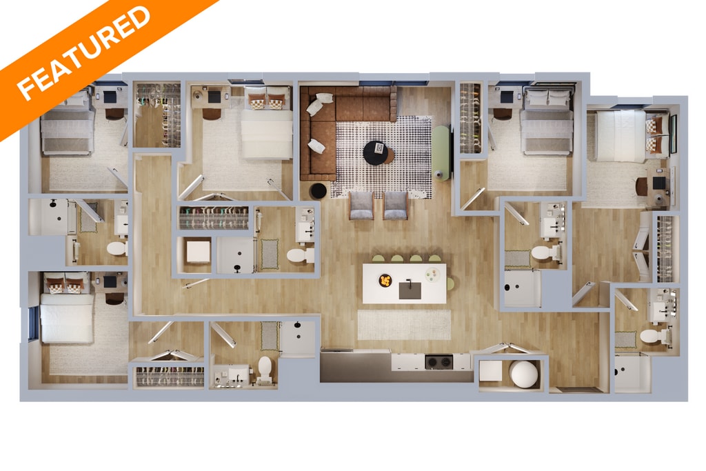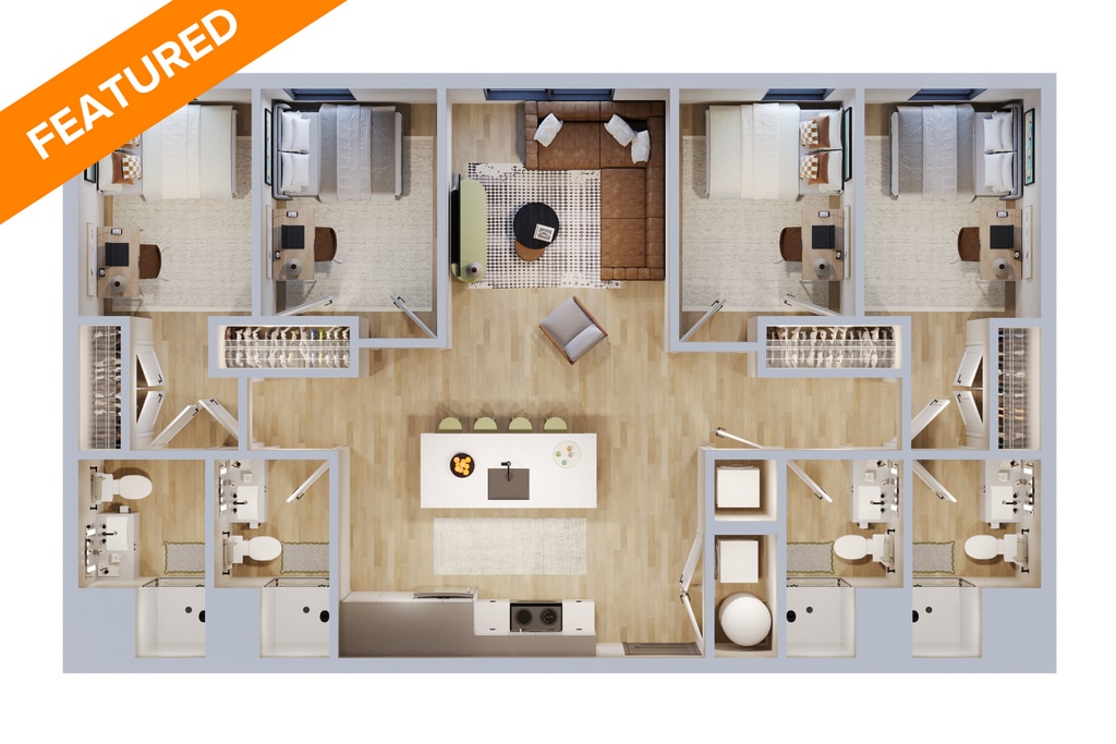 Modelo de apartamento: 4BR/4BA - D2Desde $1,4504 Dormitorios, 4 Baños, 1203 sq ftDisponible August 7, 2026Los planos son representaciones artísticas. Todas las dimensiones son aproximadas. El producto y las especificaciones reales pueden variar en tamaño o detalle. No todas las características están disponibles en cada vivienda en alquiler. Por favor, consulta con un representante para obtener más detalles.