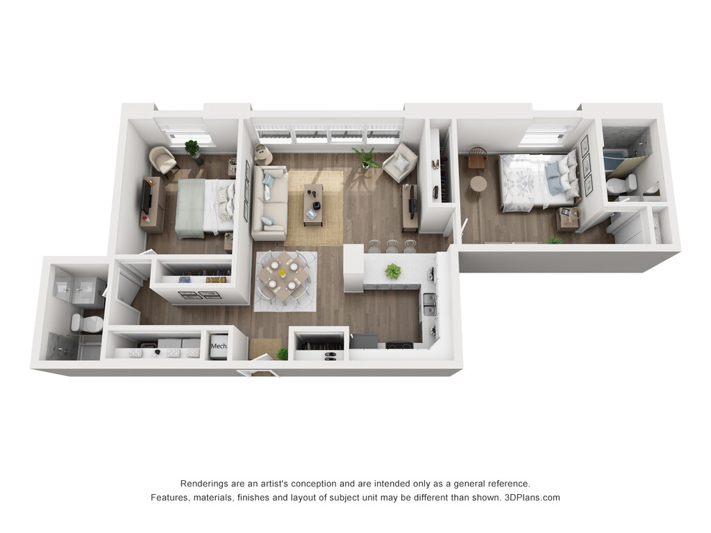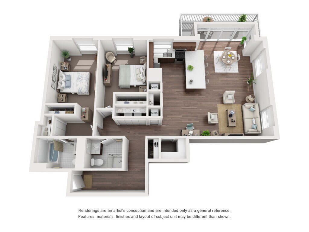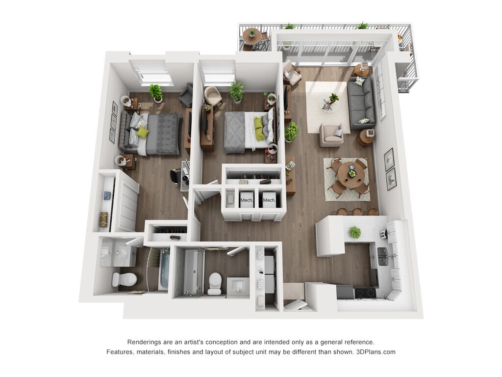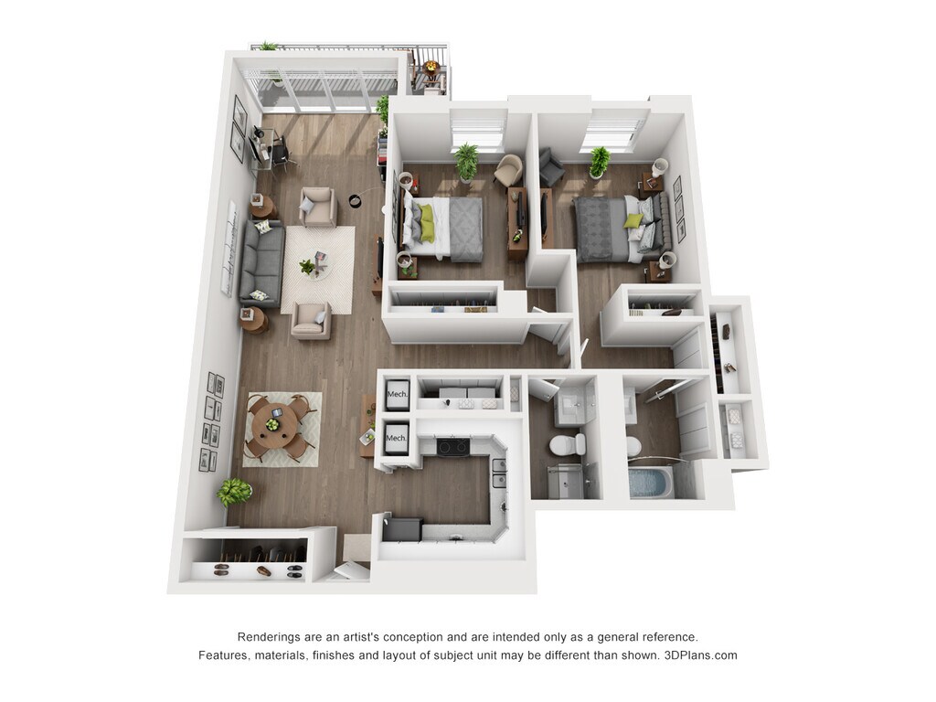 2 Bed 2 Bath - Plano 3 Los planos de la planta son una interpretación artística. Todas las dimensiones son aproximadas. Los tamaños o el detalle del producto real y sus especificaciones pueden variar. No todas las características están disponibles en todos los hogares para rentar. Los precios y la disponibilidad están sujetos a cambios. El alquiler que se muestra es mensual. Se pueden aplicar ciertos cargos, por ejemplo, entrega de paquetes, recolección de basura, agua, servicios, etc. Depositos varian. Consulta a un representante para conocer detalles.
