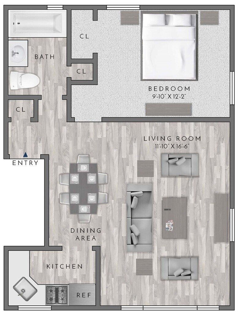 1 Dormitorio, 1 Baño, 610 pies²Disponible AhoraGalería del Modelo