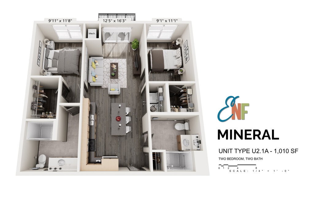 Modelo de apartamento: MineralDesde $6602 Dormitorios, 2 Baños, 950 sq ftDisponible June 15, 2026![]()